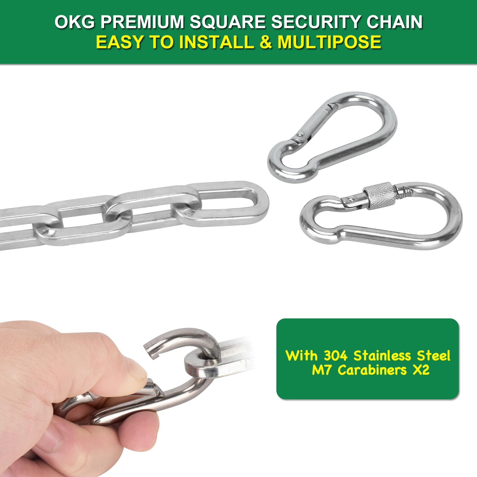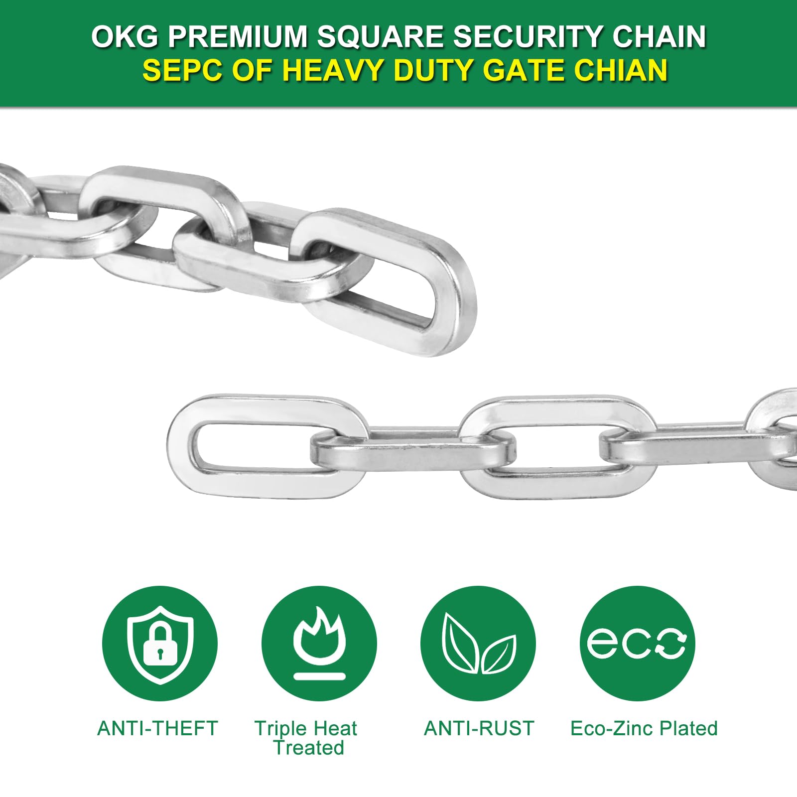 - ✓ UNBREAKABLE STRENGTH: The OKG Security Square Gate Chain is made of hardened HI-TECH alloy steel, 2 feet long and difficult to cut. It has a tensile force of 26kN and a cut force of 29kN. It also has a surface hardness of 60HRC and an Eco-zinc plating coating to resist rust and corrosion.