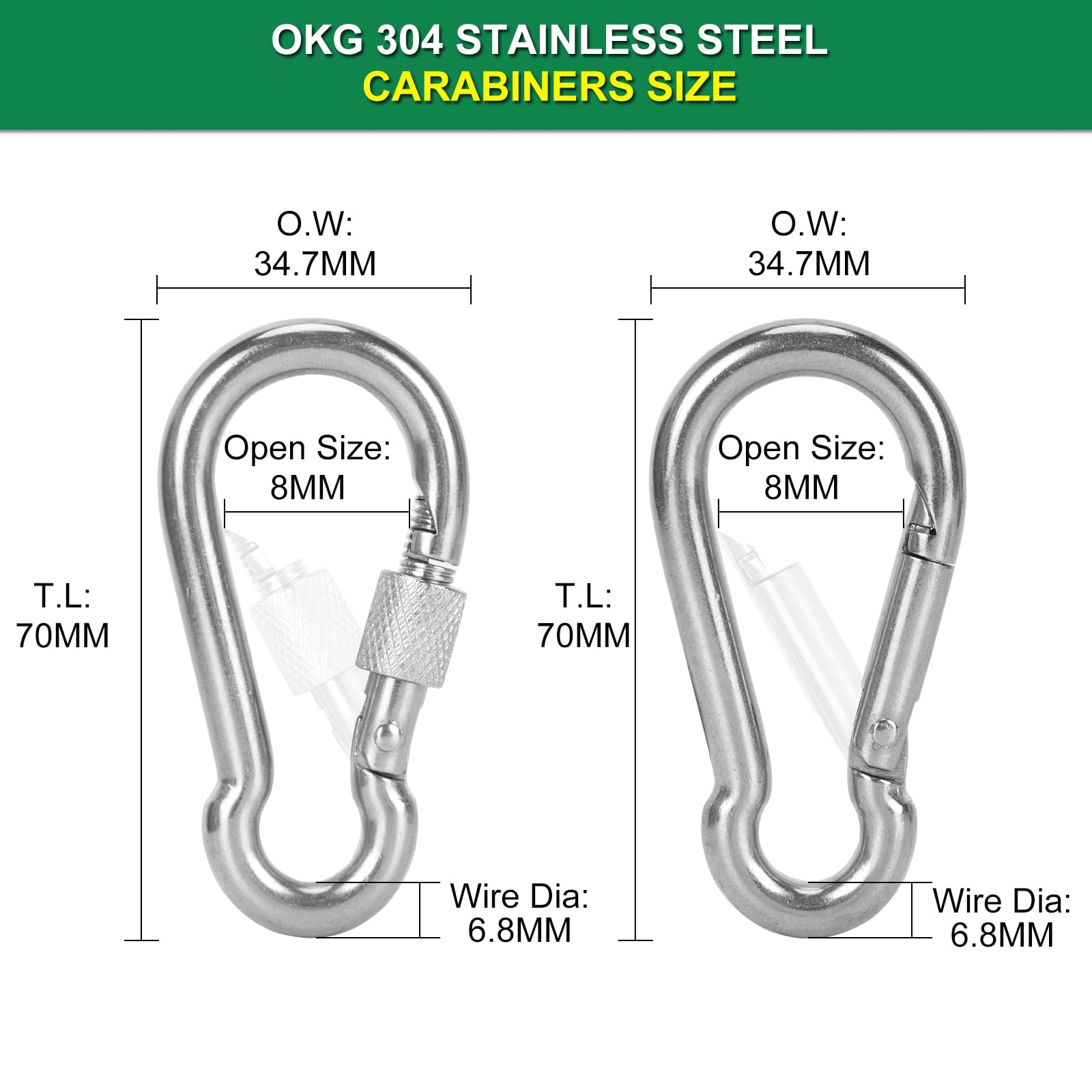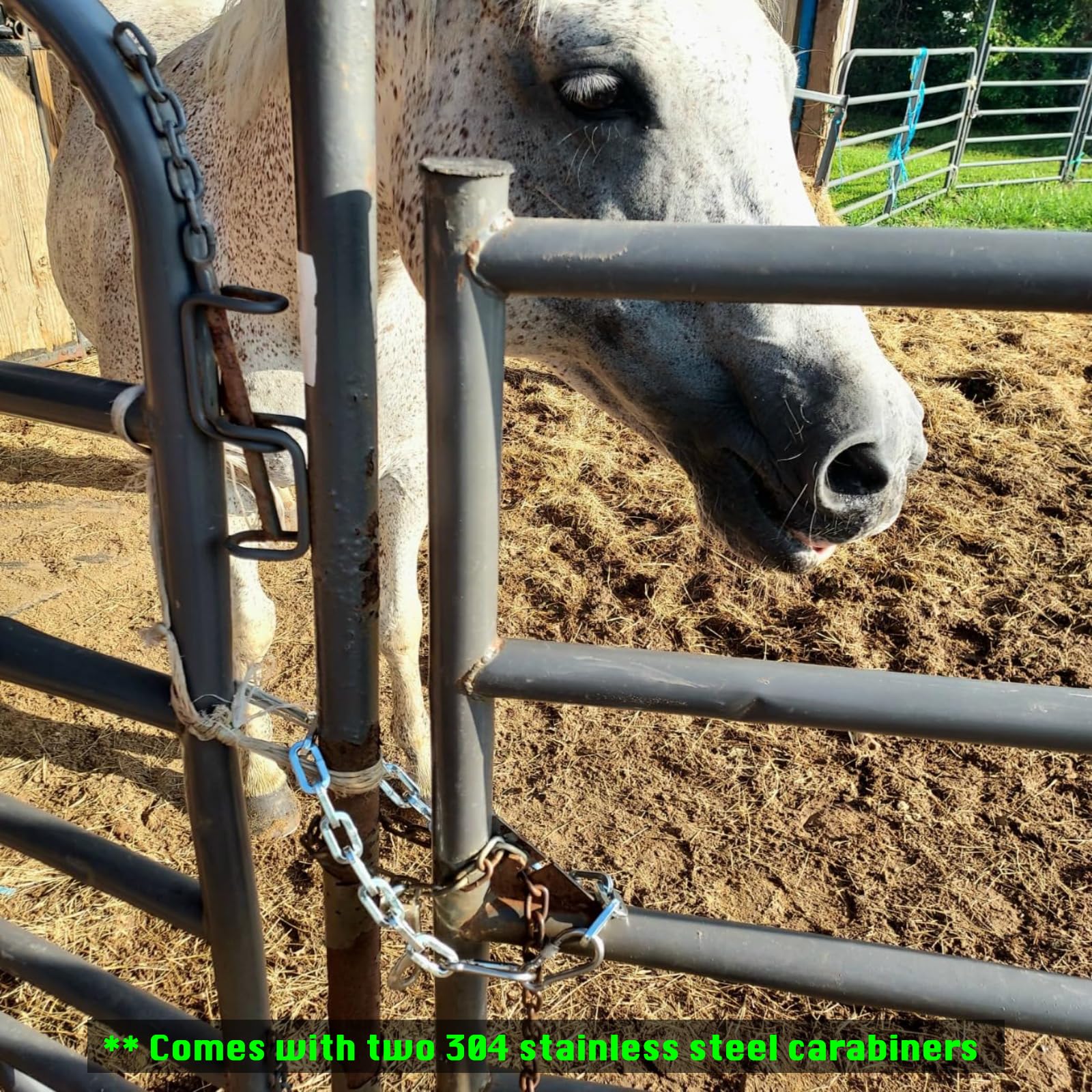- ✓ EASY TO USE AND ADJUST: The gate fence chain is designed with spring-loaded hooks for easy use and adjustment. The carabiners can be removed when not in use. To ensure a high level of security, it is recommended to use a padlock with an outside diameter of less than 9 mm for a perfect fit. In addition, the included stainless-steel carabiners are adjustable in gate chain length.